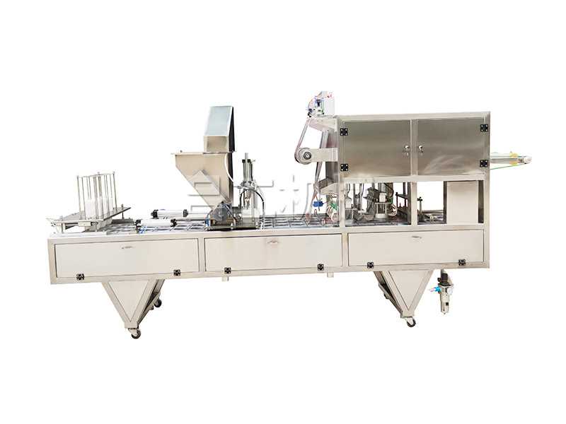 本機(jī)采用合理的機(jī)械傳動,功能齊全,灌裝、封口、切邊、制品推出,廢料收卷,印碼等自動化工作,可節(jié)約人力,降低成本。本機(jī)有二次熱封裝置,料杯/碗/盒與封膜經(jīng)過前后二次熱封,封口牢固可靠。